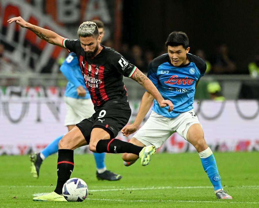 AC Milan's Olivier Giroud (L) vies with Napoli's Kim Min-jae. (Photo by Alberto Lingria/Xinhua)
