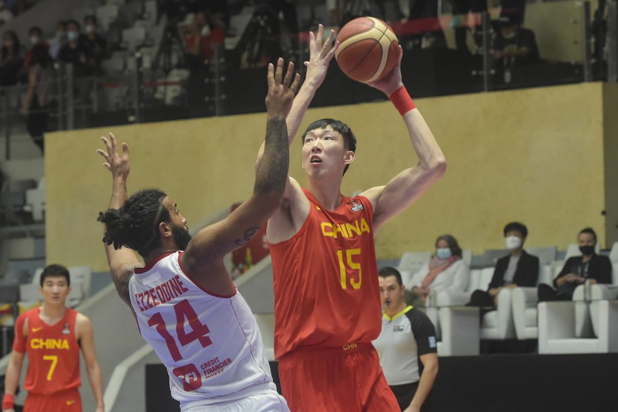 Zhou Qi (R) of China tries to shoot during a quarterfinal match against Lebanon at the FIBA Asia Cup 2022 in Jakarta, Indonesia, July 20, 2022. (Xinhua/Zulkarnain)