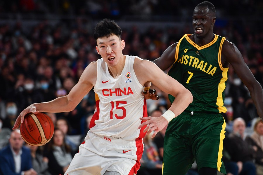 Zhou Qi (L) of China vies with Thon Maker of Australia during a Group B match at the FIBA World Cup Asian qualifiers, in Melbourne, Australia, June 30, 2022. (Photo by Bai Xue/Xinhua)