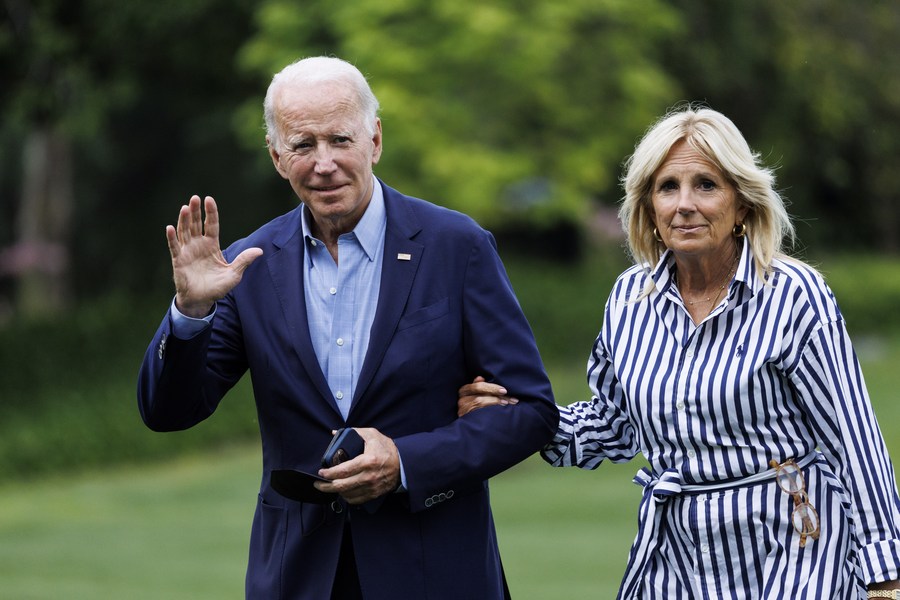 U.S. President Joe Biden and First Lady Jill Biden return to the White House in Washington D.C., the United States, Aug. 8, 2022. U.S. (Photo by Ting Shen/Xinhua)