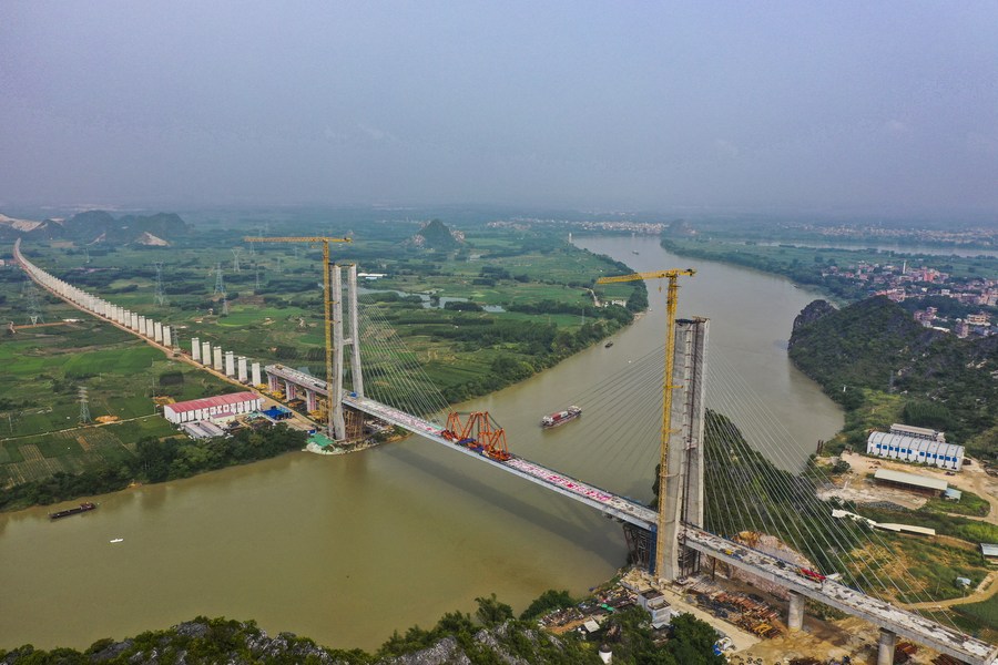 Aerial photo taken on Sept. 20, 2022 shows Baihe Yujiang River grand bridge under construction in Hengzhou, south China's Guangxi Zhuang Autonomous Region. With a 330-meter-long main span, the cable-stayed bridge of Nanning-Yulin railway achieved its closure on Tuesday. (Xinhua/Cao Yiming)