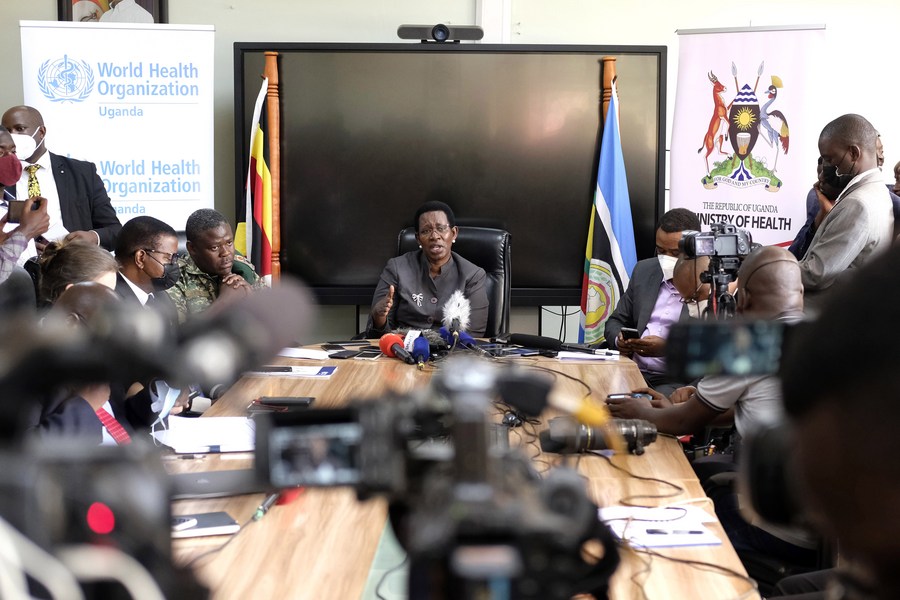 Ugandan Ministry of Health holds a press conference in Kampala, Uganda, Sept. 20, 2022. The deadly Ebola virus has broken out in central Uganda, said the country's health ministry. According to local authorities, a person was admitted to Mubende regional referral hospital on Sept. 15 after presenting Ebola symptoms and died on Sept. 19. (Photo by Hajarah Nalwadda/Xinhua)