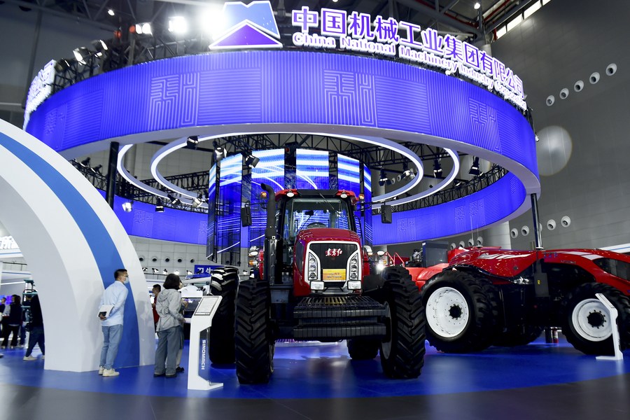 People look at tractors at the 2022 World Manufacturing Convention in Hefei, east China's Anhui Province, Sept. 20, 2022. The 2022 World Manufacturing Convention opened Tuesday in east China, highlighting the latest products, technologies and applications in the manufacturing sector. Themed "Creating a beautiful world with manufacturing," the four-day event features nearly 40 events including exhibitions, seminars, and other activities. (Xinhua/Huang Bohan)