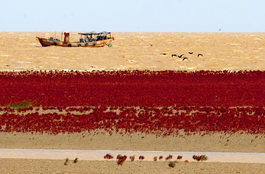 Aerial photo taken on Sept. 18, 2022 shows a wetland in the Yellow River Delta National Nature Reserve in east China's Shandong Province. (Xinhua/Fan Changguo)