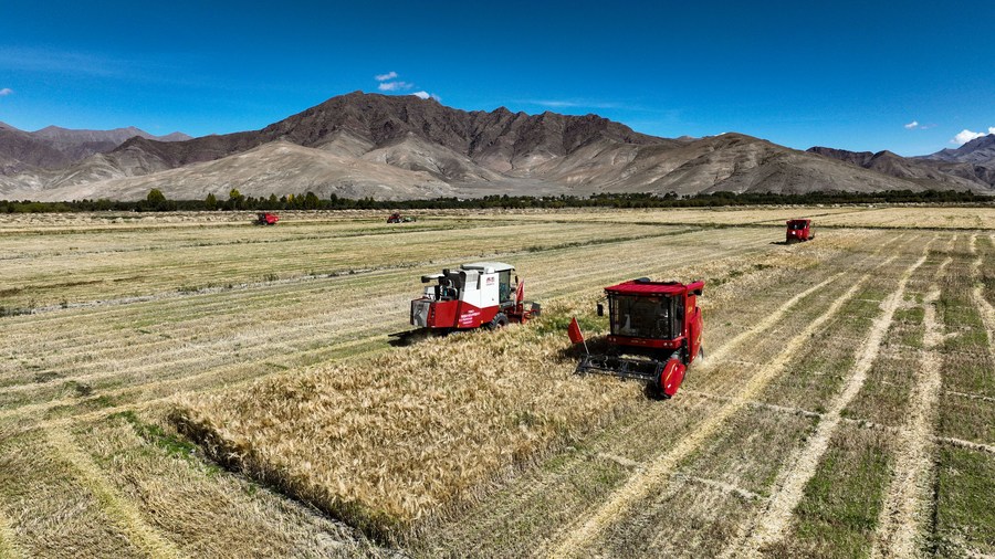 Aerial photo taken on Sept. 19, 2022 shows harvest machines operating in the highland barley field in Rasog Township of Gyangze County, Xigaze, southwest China's Tibet Autonomous Region. (Xinhua/Jigme Dorje)