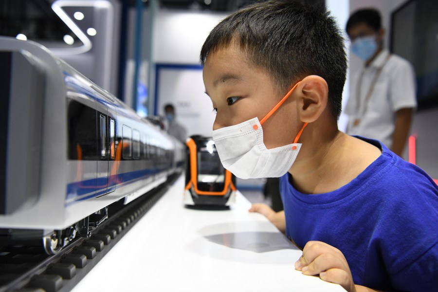 A kid visits the booth of the China Railway Rolling Stock Corporation (CRRC) at the 2022 World Manufacturing Convention in Hefei, east China's Anhui Province, Sept. 20, 2022. (Xinhua/Zhang Duan)