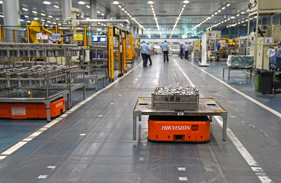 An intelligent logistic device is seen at a smart factory in the economic and technological development zone in Nanchang, east China's Jiangxi Province, Sept. 20, 2022. The economic and technological development zone integrated digital technology with industrial manufacturing in recent years to promote economic transformation and upgrading. (Xinhua/Wan Xiang)