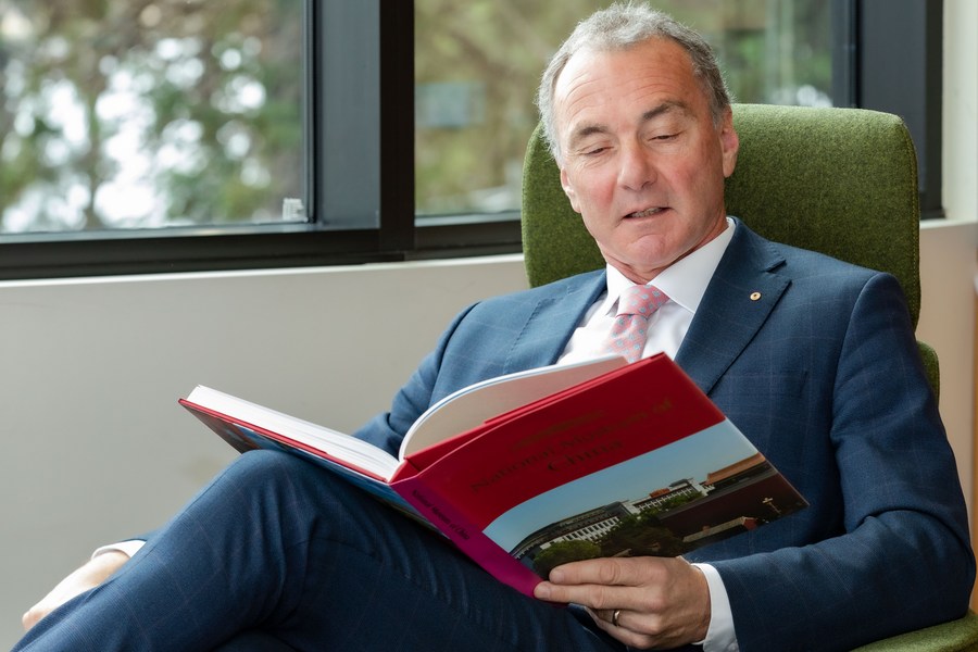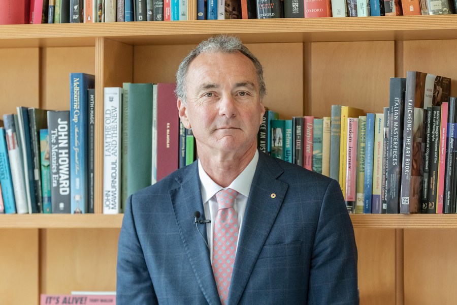 Photo taken on Sept. 7, 2022, shows Mathew Trinca, director of the National Museum of Australia, at an interview with Xinhua in Canberra, Australia. (Photo by Chu Chen/Xinhua)