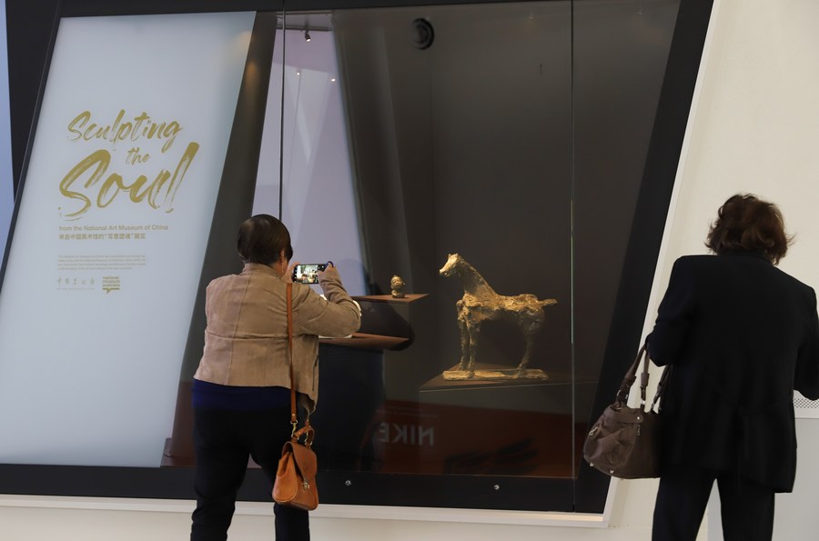 People view modern Chinese sculptures at the National Museum of Australia in Canberra, Australia, on Dec. 9, 2021. (Photo by Liu Changchang/Xinhua)