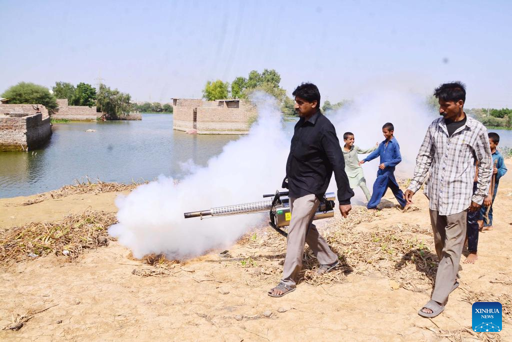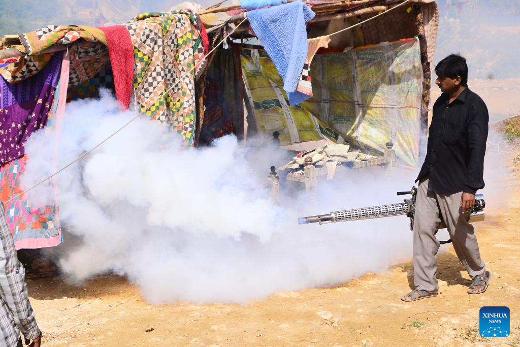 A health worker fumigates an area to remove mosquitoes on the outskirts of Hyderabad, Sindh province, Pakistan, on Sept. 21, 2022. The spread of dengue fever in Pakistan continued to get severe as 27 patients had died in the country's southern Sindh so far this month, the provincial health department reported. (Str/Xinhua)