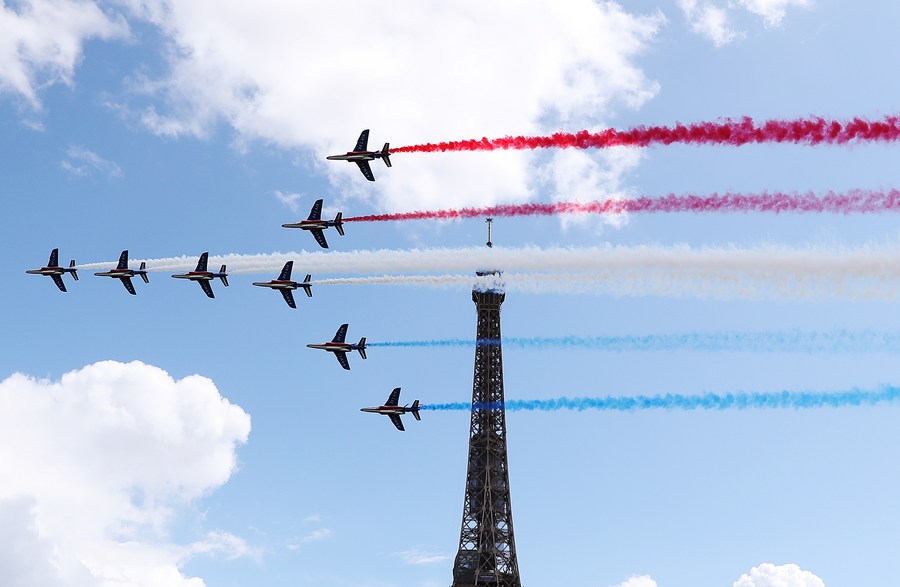 The French Aerial Patrol perform in front of the Eiffel Tower, in Paris, Aug. 8, 2021. (Xinhua/Gao Jing)