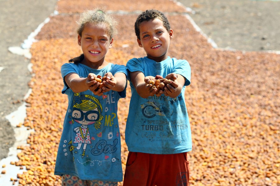 Children show dried dates at Dahshur village in Giza, Egypt, on Sept. 21, 2022. (Xinhua/Ahmed Gomaa)