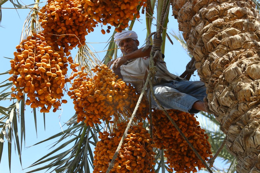 A farmer harvests dates at Dahshur village in Giza, Egypt, on Sept. 21, 2022. (Xinhua/Ahmed Gomaa)
