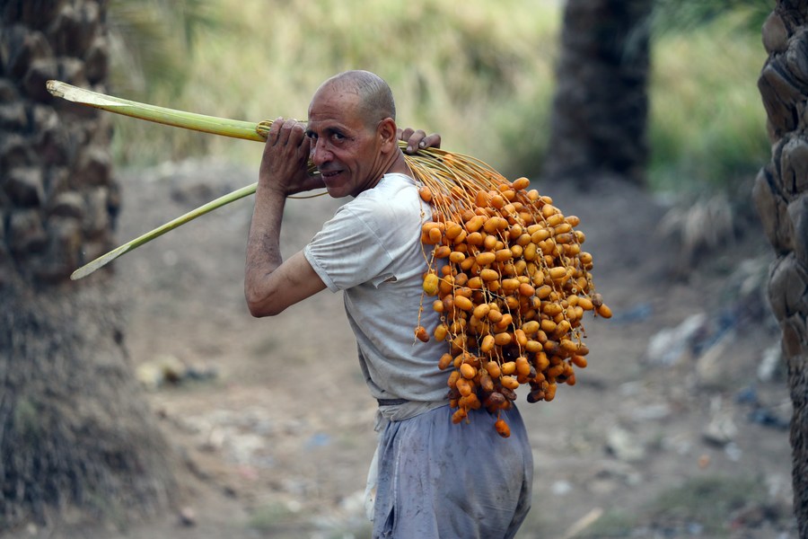A farmer carries newly-harvested dates from a tree at Dahshur village in Giza, Egypt, on Sept. 21, 2022. (Xinhua/Ahmed Gomaa)