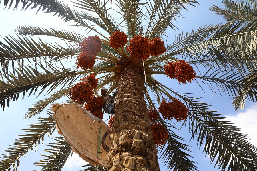 A farmer harvests dates on a tree at Dahshur village in Giza, Egypt, on Sept. 21, 2022. (Xinhua/Ahmed Gomaa)