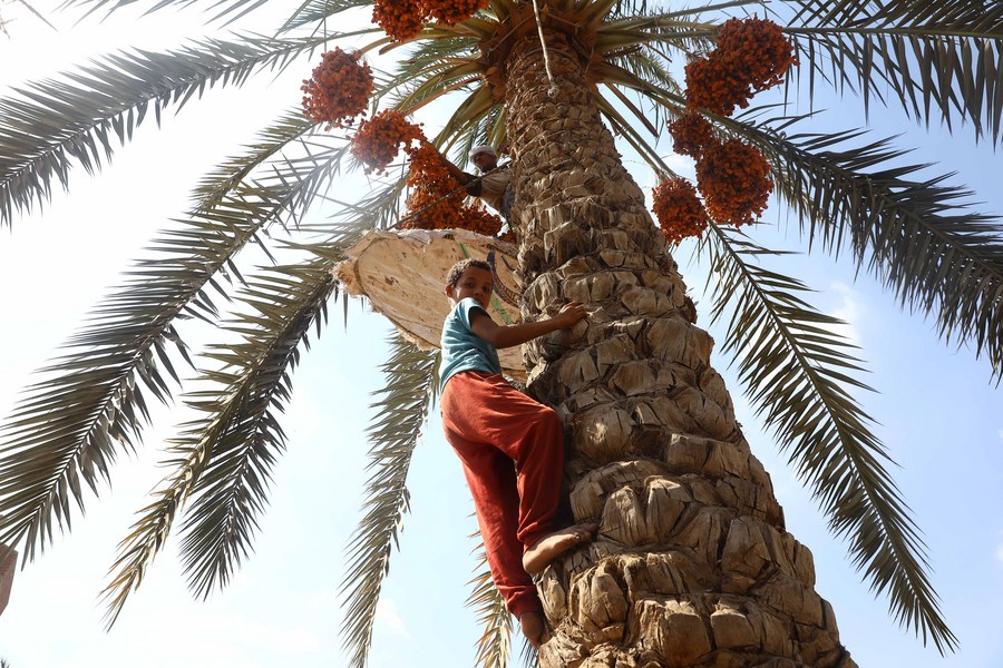 A boy climbs a tree to help his father harvest dates at Dahshur village in Giza, Egypt, on Sept. 21, 2022. (Xinhua/Ahmed Gomaa) ■