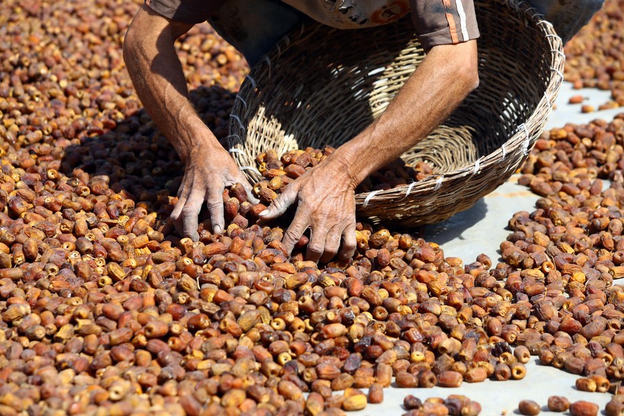 A farmer dries dates at Dahshur village in Giza, Egypt, on Sept. 21, 2022. (Xinhua/Ahmed Gomaa)