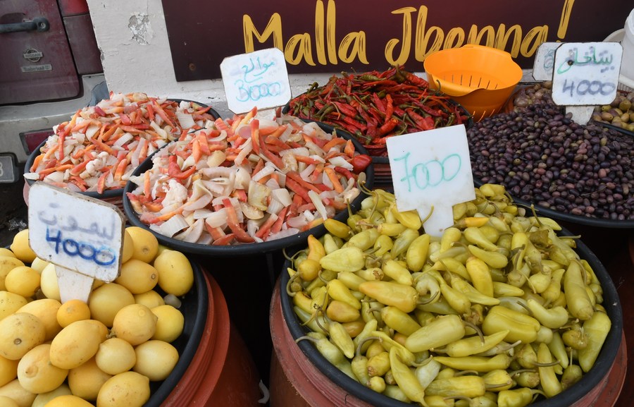 Photo taken on April 9, 2022 shows pickles at a market in Tunis, Tunisia. (Photo by Adel Ezzine/Xinhua)