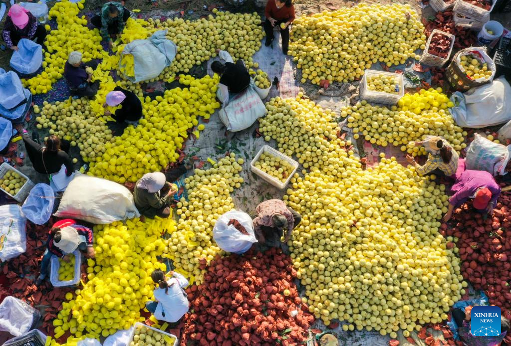 Aerial photo taken on Sept. 15, 2022 shows villagers sorting out and packaging yellow peaches in Dongjiuzhai Town of Zunhua, north China's Hebei Province. Chinese farmers' harvest festival, which coincides with the Autumn Equinox each year, falls on Sept. 23 this year. (Photo by Liu Mancang/Xinhua)