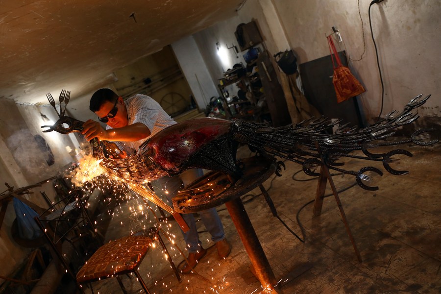 Egyptian sculptor Ammar Shiha makes an artwork with scrap metal at his home in Giza, Egypt, on Sept. 3, 2022. (Xinhua/Ahmed Gomaa)
