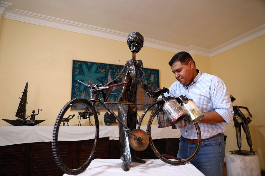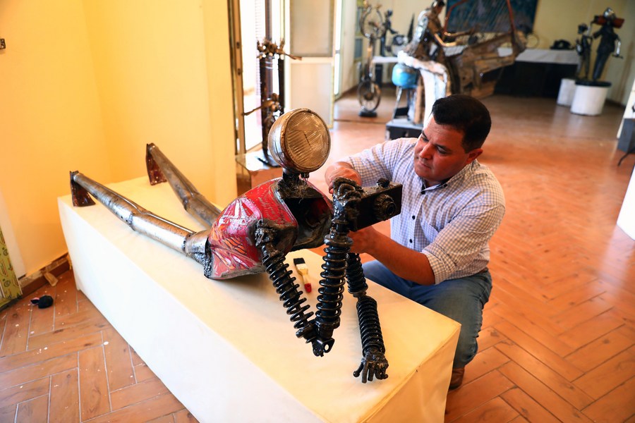 Egyptian sculptor Ammar Shiha cleans one of his artworks made of scrap metal at his home in Giza, Egypt, on Sept. 3, 2022. (Xinhua/Ahmed Gomaa)