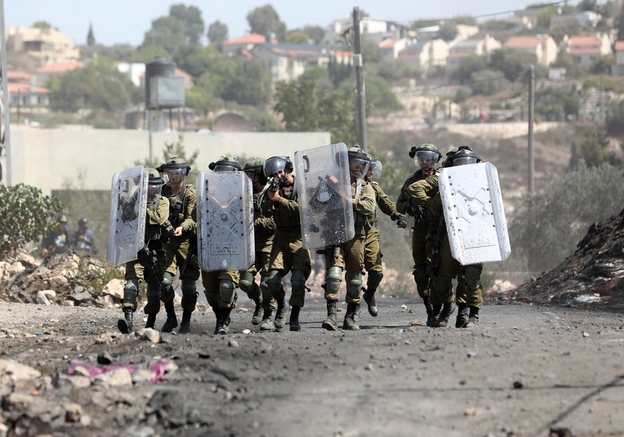 Israeli soldiers aim their weapons at Palestinian protesters during clashes following a protest against the expansion of Jewish settlements in the West Bank village of Kafr Qaddum, near Nablus, on Sept. 23, 2022. (Photo by Ayman Nobani/Xinhua)