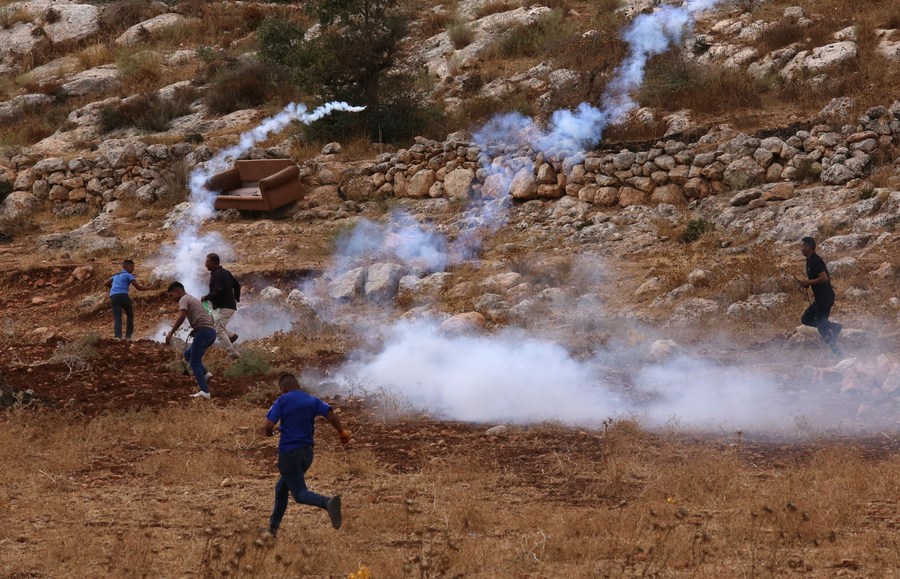 Palestinian protesters run to take cover from tear gas canisters fired by Israeli soldiers during clashes following a protest against the expansion of Jewish settlements in the West Bank village of Beit Dajan, east of Nablus, on Sept. 23, 2022. (Photo by Nidal Eshtayeh/Xinhua)