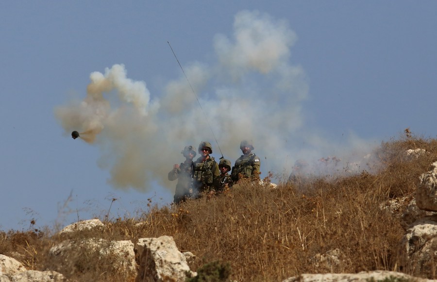 An Israeli soldier fires a tear gas canister at Palestinian protesters during clashes following a protest against the expansion of Jewish settlements in the West Bank village of Beit Dajan, east of Nablus, on Sept. 23, 2022. (Photo by Nidal Eshtayeh/Xinhua)