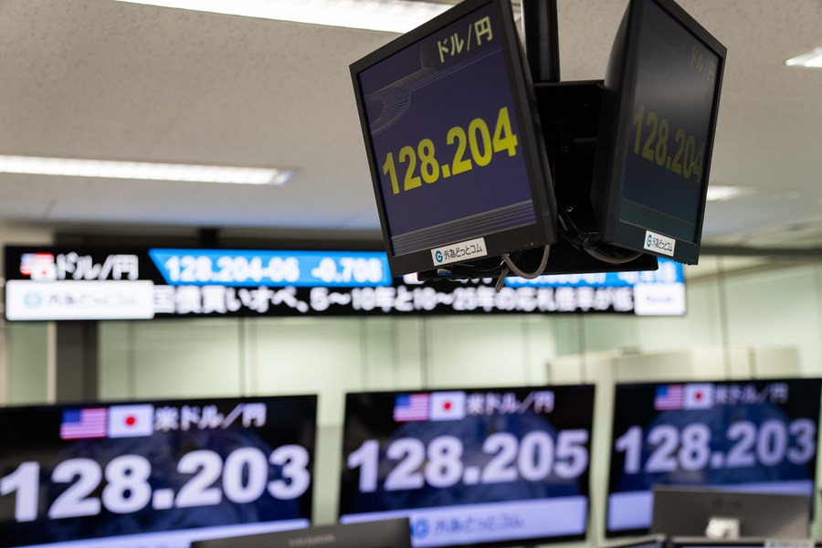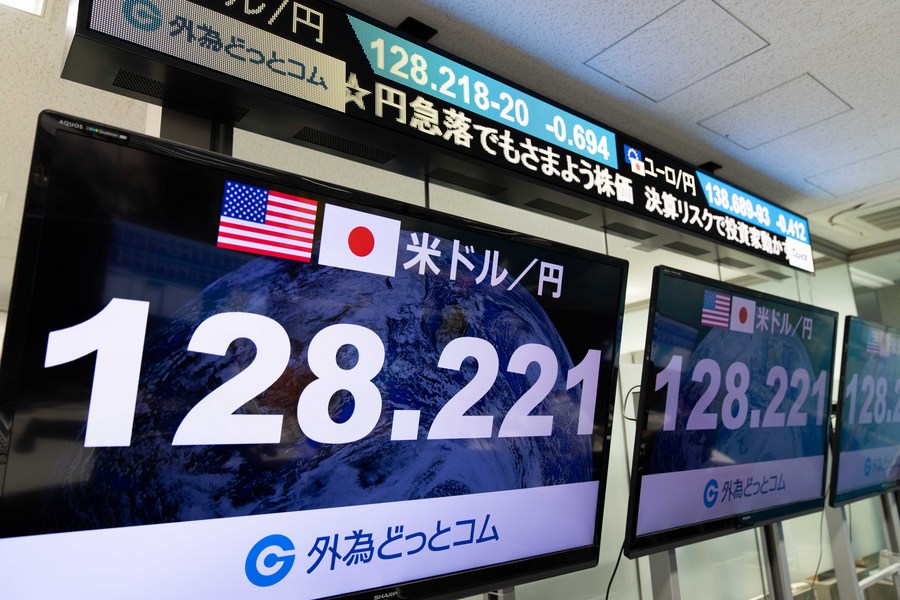 A display shows an exchange rate between the Japanese yen and the U.S. dollar at a foreign exchange brokerage in Tokyo, Japan, on April 20, 2022. (Xinhua/Zhang Xiaoyu)