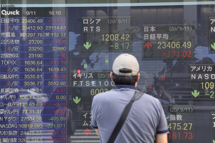A man watches an electronic board showing the stock index in Tokyo, Japan, on Sept. 11, 2020. (Xinhua/Du Xiaoyi)