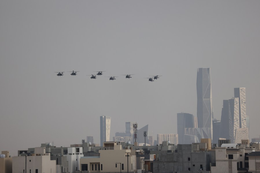 Helicopters from the Royal Saudi Air Force perform during an air show to celebrate Saudi Arabia's National Day in Riyadh, Saudi Arabia, on Sept. 22, 2022. (Xinhua/Wang Haizhou)