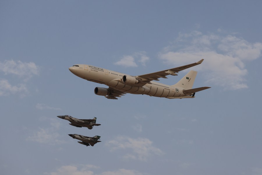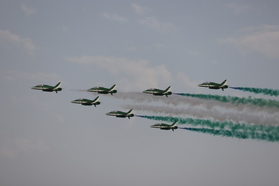 Aircraft from the Royal Saudi Air Force perform during an air show to celebrate Saudi Arabia's National Day in Riyadh, Saudi Arabia, on Sept. 22, 2022. (Xinhua/Wang Haizhou)