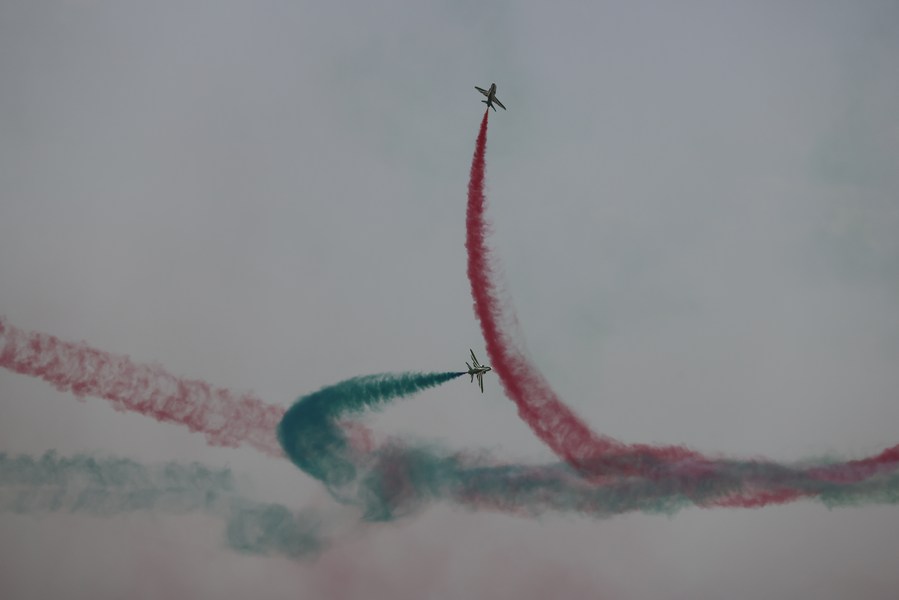 Aircraft from the Saudi Hawks aerobatic display team perform during an air show to celebrate Saudi Arabia's National Day in Riyadh, Saudi Arabia, on Sept. 22, 2022. (Xinhua/Wang Haizhou)