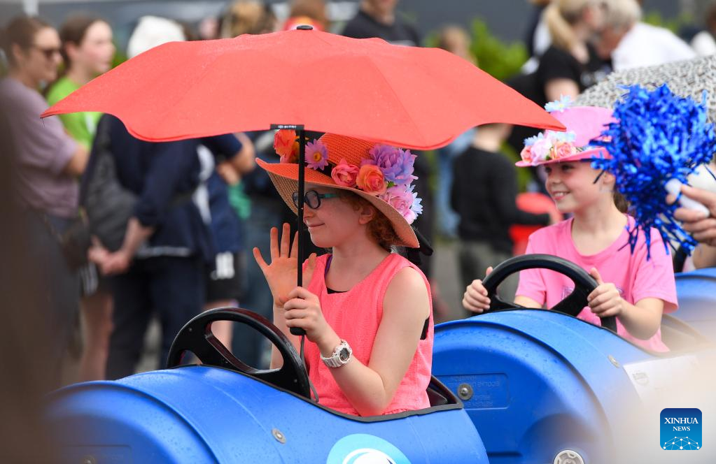 Kids participate in the Hastings Blossom Parade in Hastings, New Zealand, Sept. 24, 2022. Hastings Blossom Parade, the biggest annual event of its kind in New Zealand, attracts tens of thousands of viewers and participants from all over the country to join in the Spring gala here on Saturday. (Xinhua/Guo Lei)