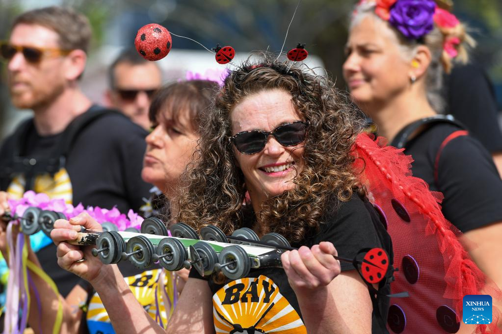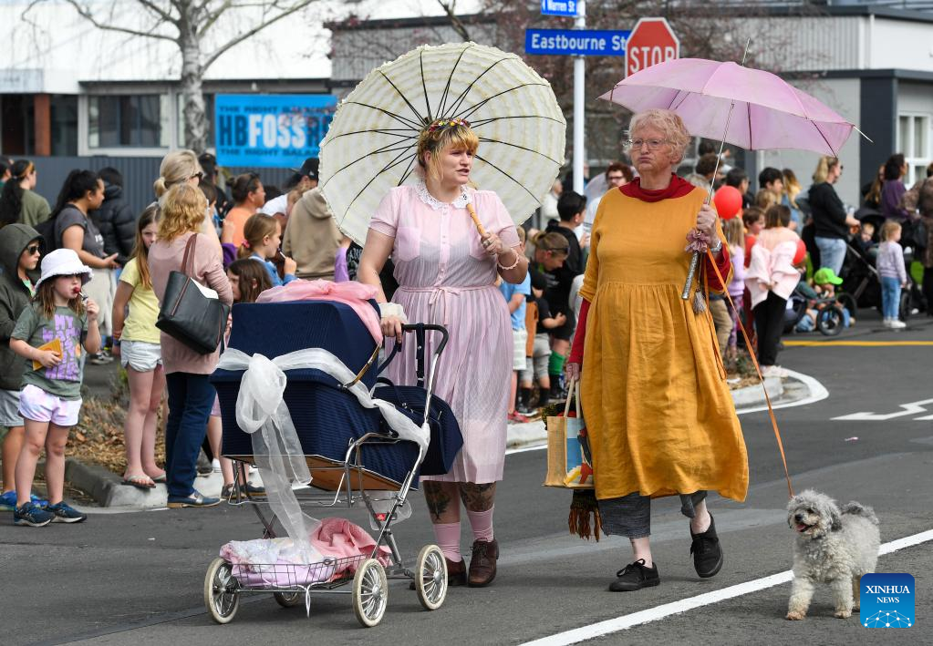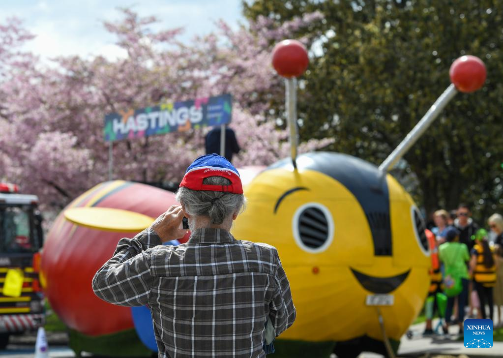 People participate in the Hastings Blossom Parade in Hastings, New Zealand, Sept. 24, 2022. Hastings Blossom Parade, the biggest annual event of its kind in New Zealand, attracts tens of thousands of viewers and participants from all over the country to join in the Spring gala here on Saturday. (Xinhua/Guo Lei)