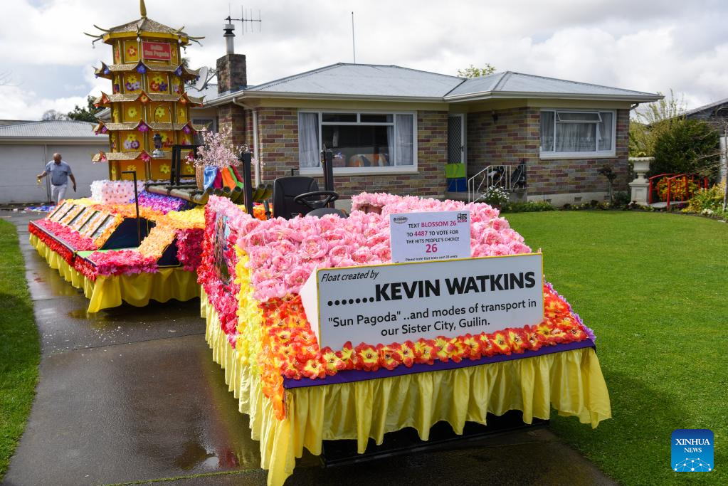 Kevin Watkins, a 73-year-old Hastings district councilor, brought his Guilin Sun Pagoda float this year to attract viewers and finally won the prize of the best Blossom decorated float during the event.