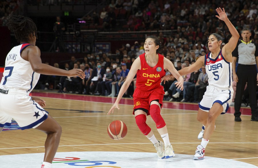 Wang Siyu (C) of China drives the ball with the defense of Kelsey Plum (R) of the United States during a Group A match at the FIBA Women's Basketball World Cup 2022 in Sydney, Australia, Sept. 24, 2022. (Photo by Hu Jingchen/Xinhua)