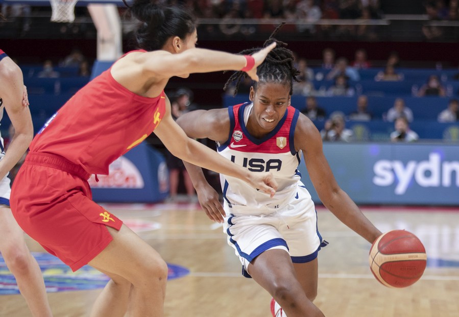 Shakira Austin (R) of the United States drives the ball during a Group A match against China at the FIBA Women's Basketball World Cup 2022 in Sydney, Australia, Sept. 24, 2022. (Photo by Hu Jingchen/Xinhua)