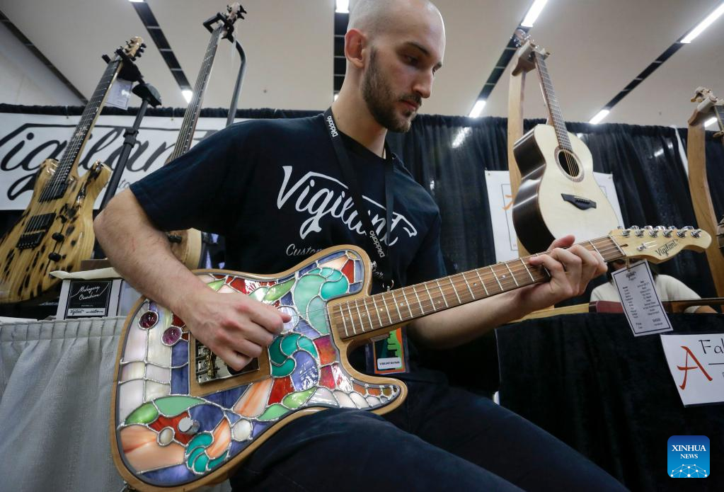 A musician tries a handmade guitar at the Vancouver International Guitar Festival in Vancouver, Canada, on Sept. 24, 2022. After a two-year suspension due to the pandemic, the event returned to Vancouver this Saturday and Sunday, featuring more than 60 guitar makers from Canada, the United States, and European countries. (Photo by Liang Sen/Xinhua)