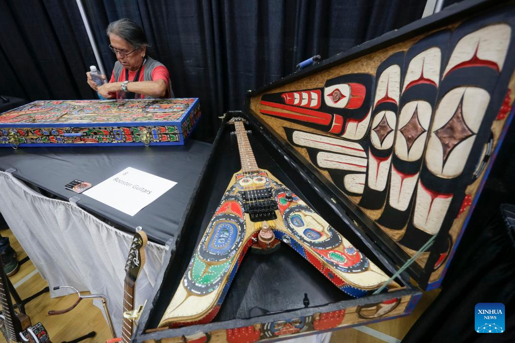 A visitor views guitars at the Vancouver International Guitar Festival in Vancouver, Canada, on Sept. 24, 2022. After a two-year suspension due to the pandemic, the event returned to Vancouver this Saturday and Sunday, featuring more than 60 guitar makers from Canada, the United States, and European countries. (Photo by Liang Sen/Xinhua)