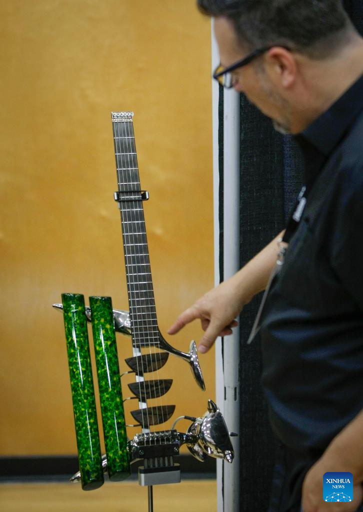 A visitor looks at a handmade electric guitar at the Vancouver International Guitar Festival in Vancouver, Canada, on Sept. 24, 2022. After a two-year suspension due to the pandemic, the event returned to Vancouver this Saturday and Sunday, featuring more than 60 guitar makers from Canada, the United States, and European countries. (Photo by Liang Sen/Xinhua)