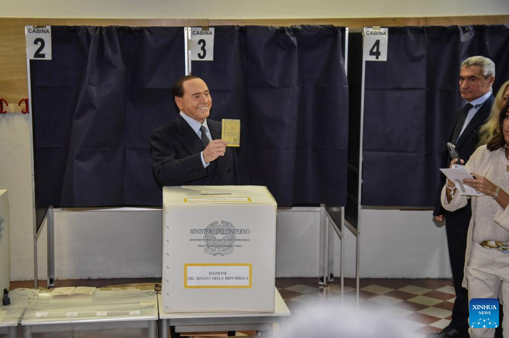 Italy's former Prime Minister and Forza Italia leader Silvio Berlusconi casts his ballot at a polling station in Milan, Italy, Sept. 25, 2022. Polls opened to renew the parliament in Italy early on Sunday, in a snap election seen as crucial for the country. (Xinhua)