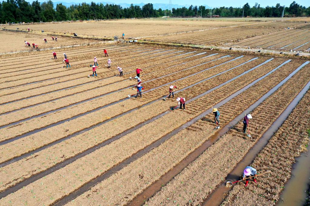 Aerial photo taken on Sept. 23, 2022 shows farmers watering vegetable seedlings in Wenling City, east China's Zhejiang Province. (Photo by Liu Zhenqing)