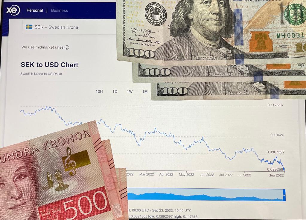 Photo taken on Sept. 23, 2022 shows Swedish krona notes and U.S. dollar notes in Stockholm, Sweden. The Swedish krona fell to a historic low against the U.S. dollar on Friday. (Xinhua/Fu Yiming)
