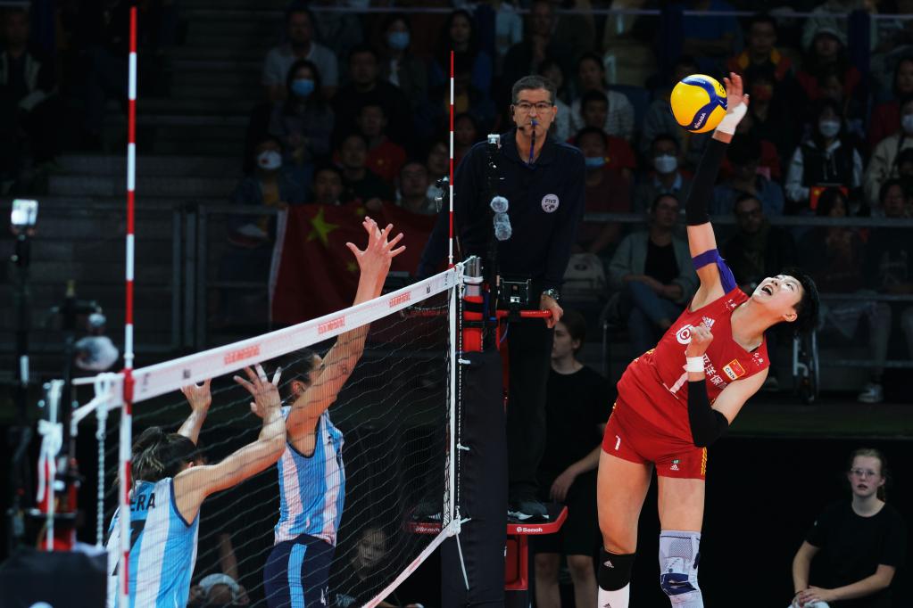 Yuan Xinyue (R) of China spikes during the Phase 1 Pool D match between China and Argentina during the 2022 Volleyball Women's World Championship in Arnhem, the Netherlands, Sept. 25, 2022. China started the FIVB Women's Volleyball World Championship with a comfortable 25-23, 25-22, 25-20 victory over Argentina in one hour and 27 minutes here on Sunday. (Xinhua/Meng Dingbo)