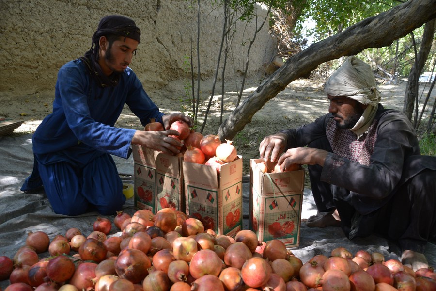 Afghan farmers package pomegranates in an orchard in Kandahar province, Afghanistan, Sept. 24, 2022. (Photo by Sanaullah Seiam/Xinhua)