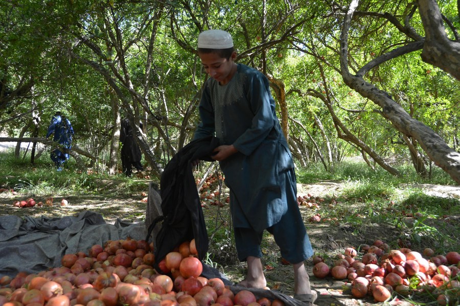 A farmer unloads pomegranates at an orchard in Kandahar Province, Afghanistan, Sept. 24, 2022. (Photo by Sanaullah Seiam/Xinhua)