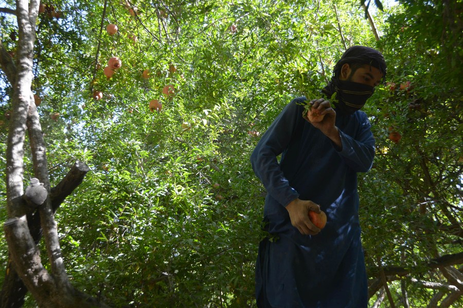A farmer picks pomegranates at an orchard in Kandahar Province, Afghanistan, Sept. 24, 2022. (Photo by Sanaullah Seiam/Xinhua)