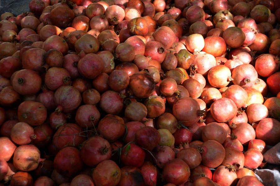 Photo taken on Sept. 24, 2022, shows pomegranates harvested in an orchard in Kandahar province, Afghanistan. (Photo by Sanaullah Seiam/Xinhua)