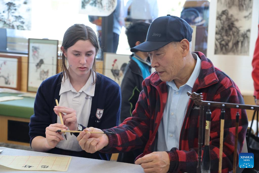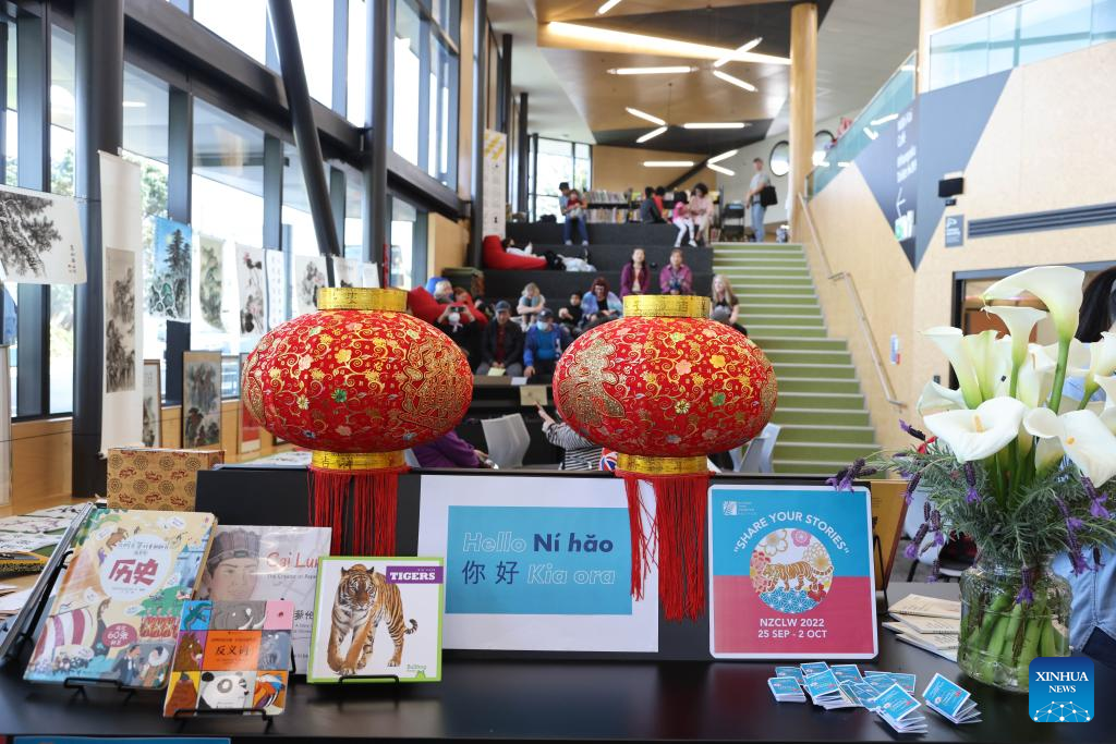 Photo taken on Sept. 27, 2022 shows a scene of a Chinese calligraphy experience activity at a community library in Wellington, New Zealand. The opening reception of New Zealand Chinese Language Week 2022 was held on Monday evening at the Grand Hall of Parliament Buildings in Wellington. During this week, New Zealand will host a series of traditional Chinese cultural activities. (Photo by Meng Tao/Xinhua)